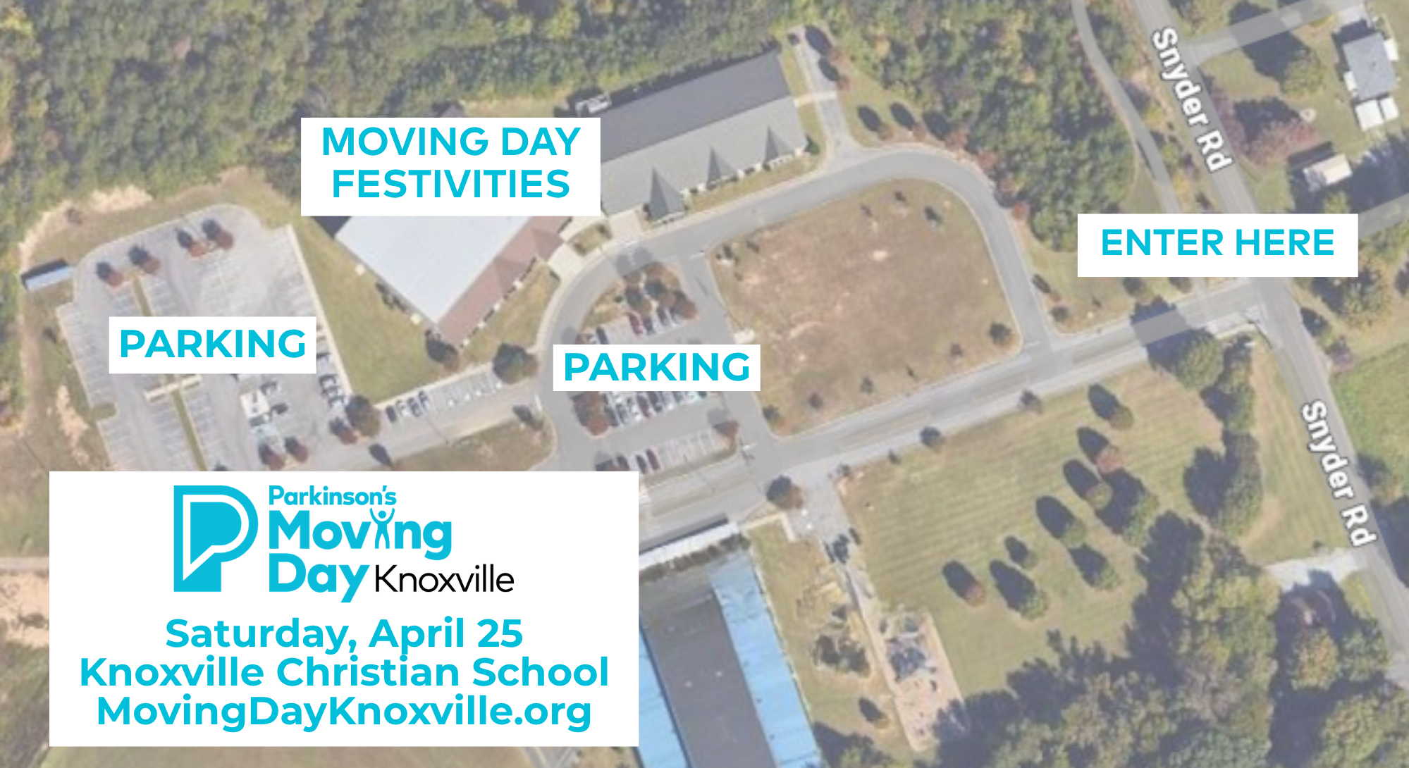 The event will be held at Knoxville Christian School, located at 11549 Snyder Rd, Knoxville, TN 37932. Follow posted directional signage near the parking area.
