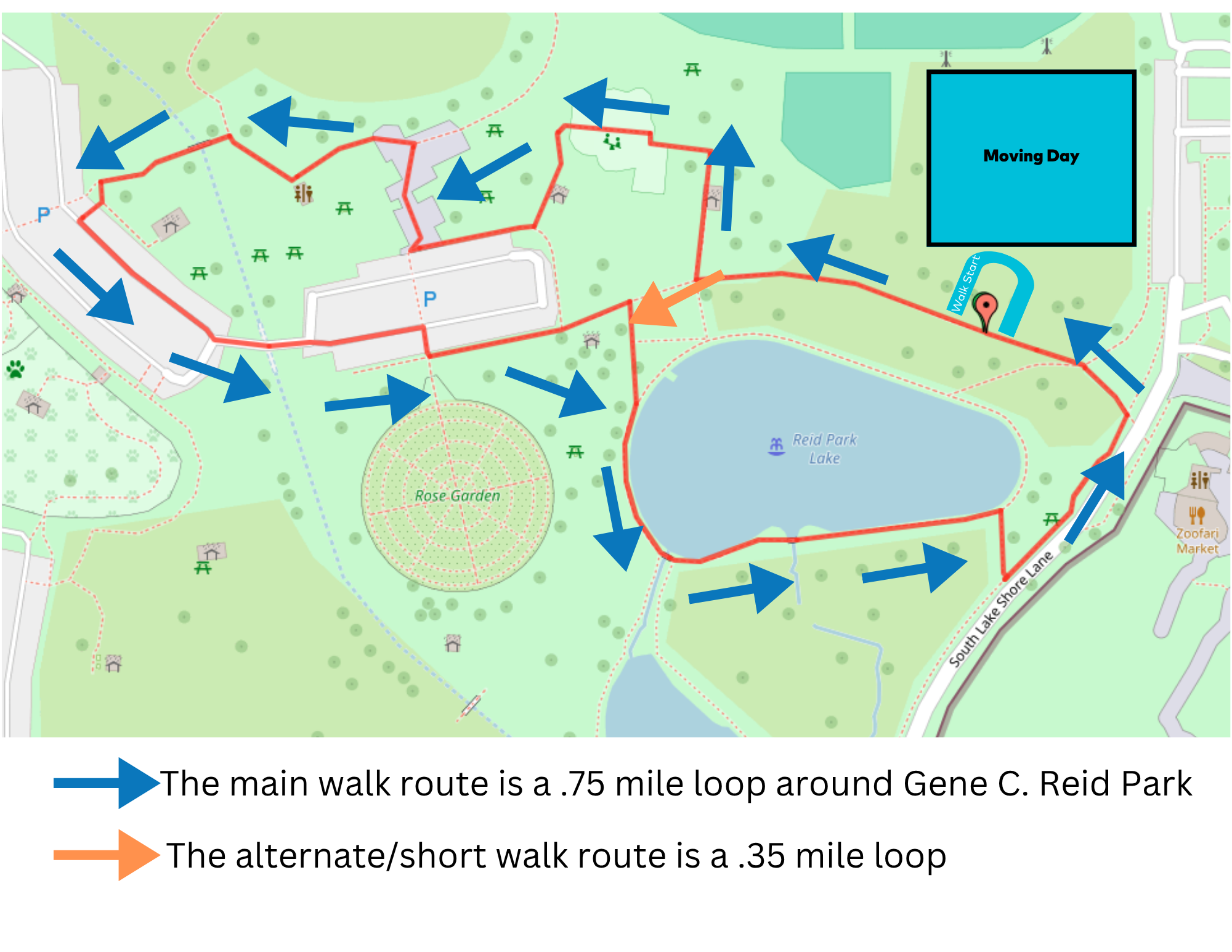 The Moving Day Walk is for participants of all ages and abilities: .35 mile option and a .75 mile option. Both paths are fully paved. Click HERE for the walk route map.