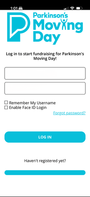 Note: Are you an alumni participant? You might have downloaded our previous version of the app, which no longer works with your fundraising page. If your app is called ‘Moving Day‘ (entry screen looks like this), please delete and download the ‘Fundraise for Parkinson’s‘ app before logging in. The correct app will have the Parkinson’s Foundation logo and say Powered by Nuclavis on the entry screen.